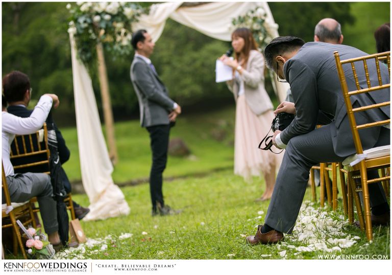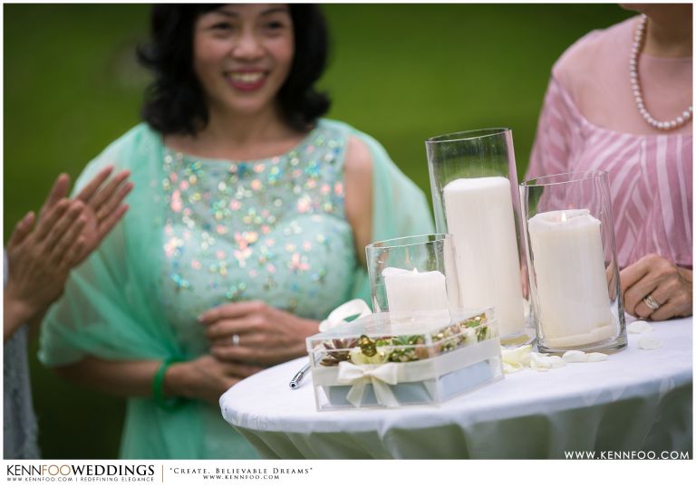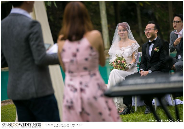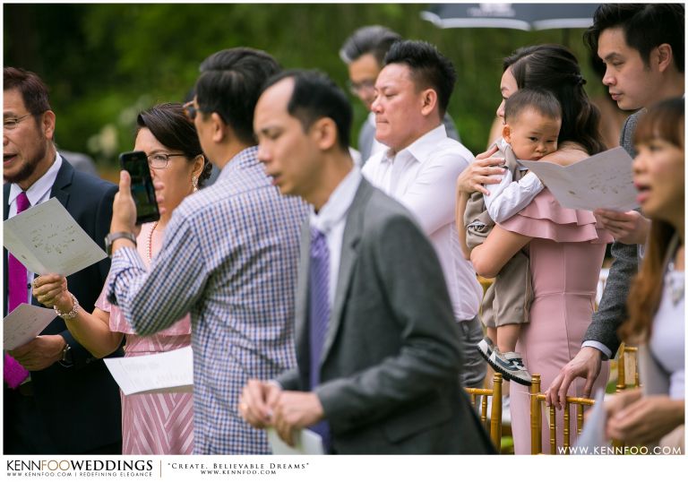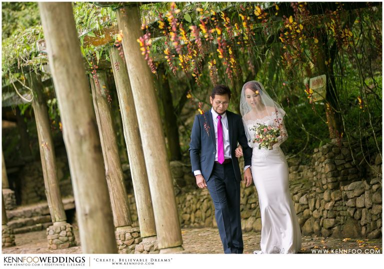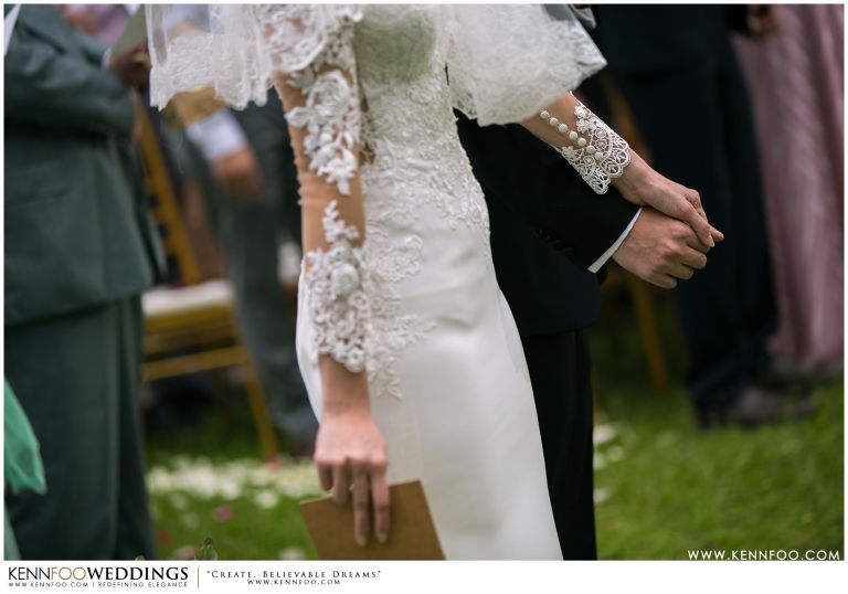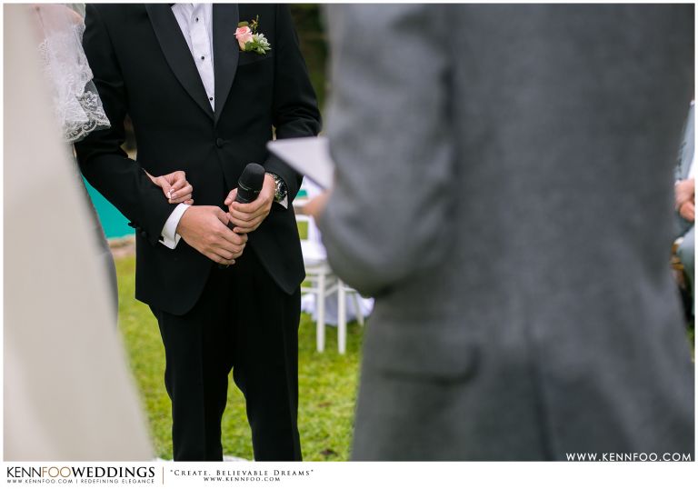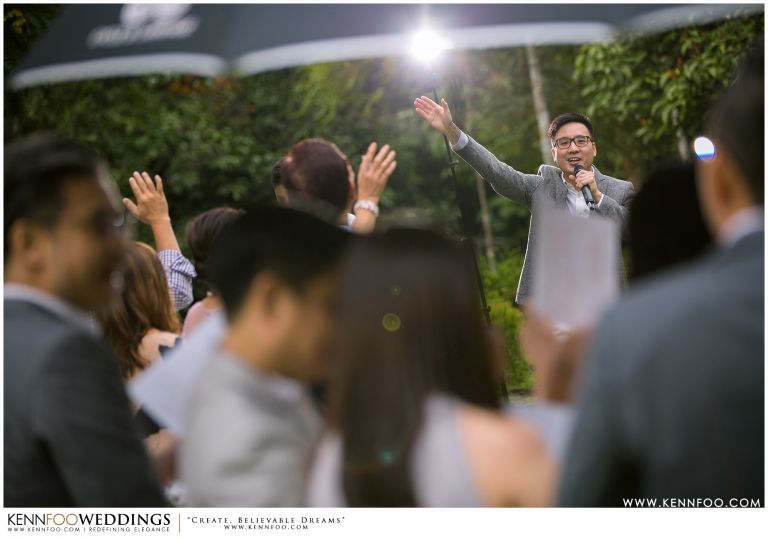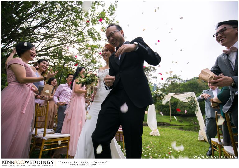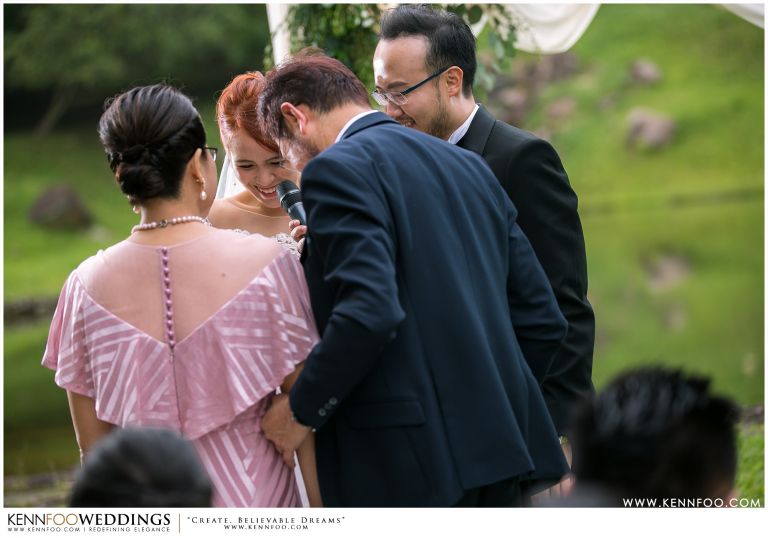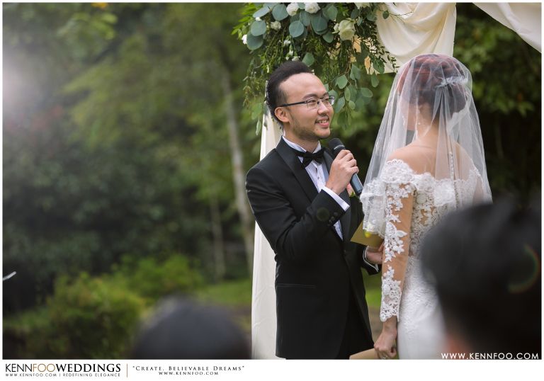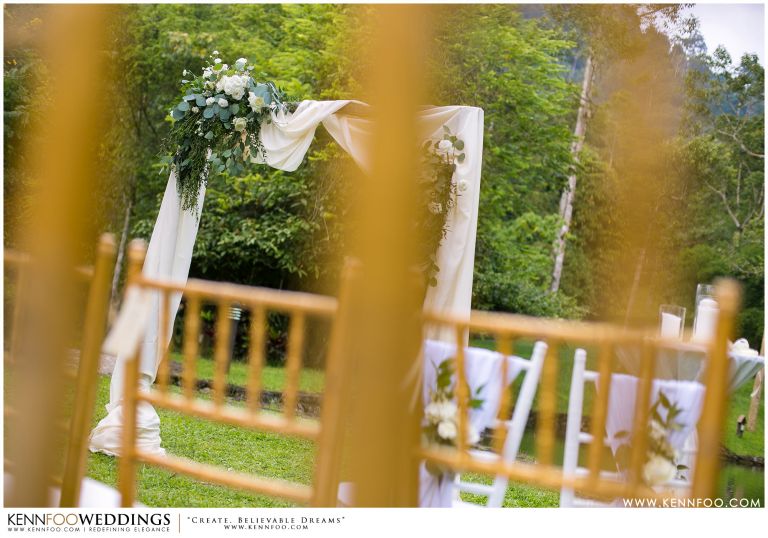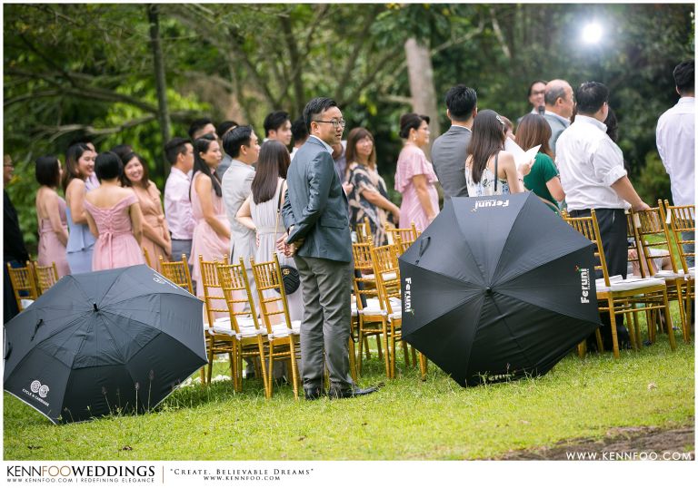 Enderong Resort is located in Pahang, say about an hour drive away from KL. It’s located at a higher elevation and offers lush nature all around the resort. On the wedding day itself, the sky was gloomy and it even drizzled a little before their vow exchange ceremony starts. Ryan, Priscilla and their families were worried, as their vow exchange was set to be at the middle of the open ‘park’ with beautiful view of the resort and a beautiful lake! Raining means they have to move everything inside the resort which will be a huge disappointment! Everyone prayed hard and God answered their prayers as the skies started to stop drizzling and the cloudy skies cleared off a little the moment their vow exchange starts. It was literally like witnessing a miracle!